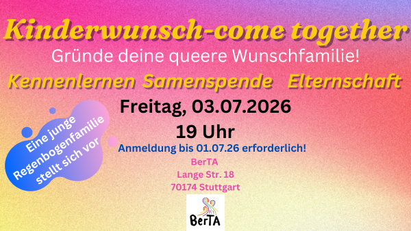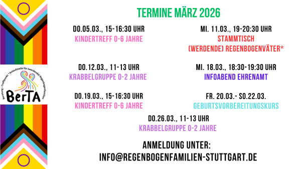 IFED Brunch, So.03.05., 11-13 Uhr https://regenbogenfamilien-stuttgart.de/wp-content/uploads/2025/04/IFED-International-Familiy-Equality-Day-Website.png 600 338 BerTA - Regenbogenfamilien in Stuttgart //regenbogenfamilien-stuttgart.de/wp-content/uploads/2021/01/BERTA_LOGO_WEB.pngDas Motto “Selbstbestimmt Familie!” zum diesjährigen IFED. Zum International Family Equality Day…